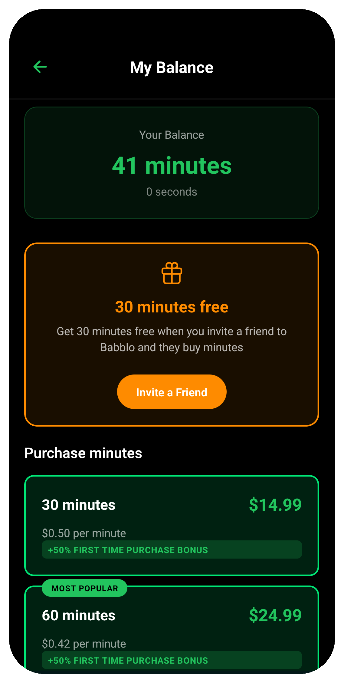 Yes! You'll get 50% extra talk time for free when you purchase your first minutes. Also - get free minutes by inviting your friends to try Babblo.