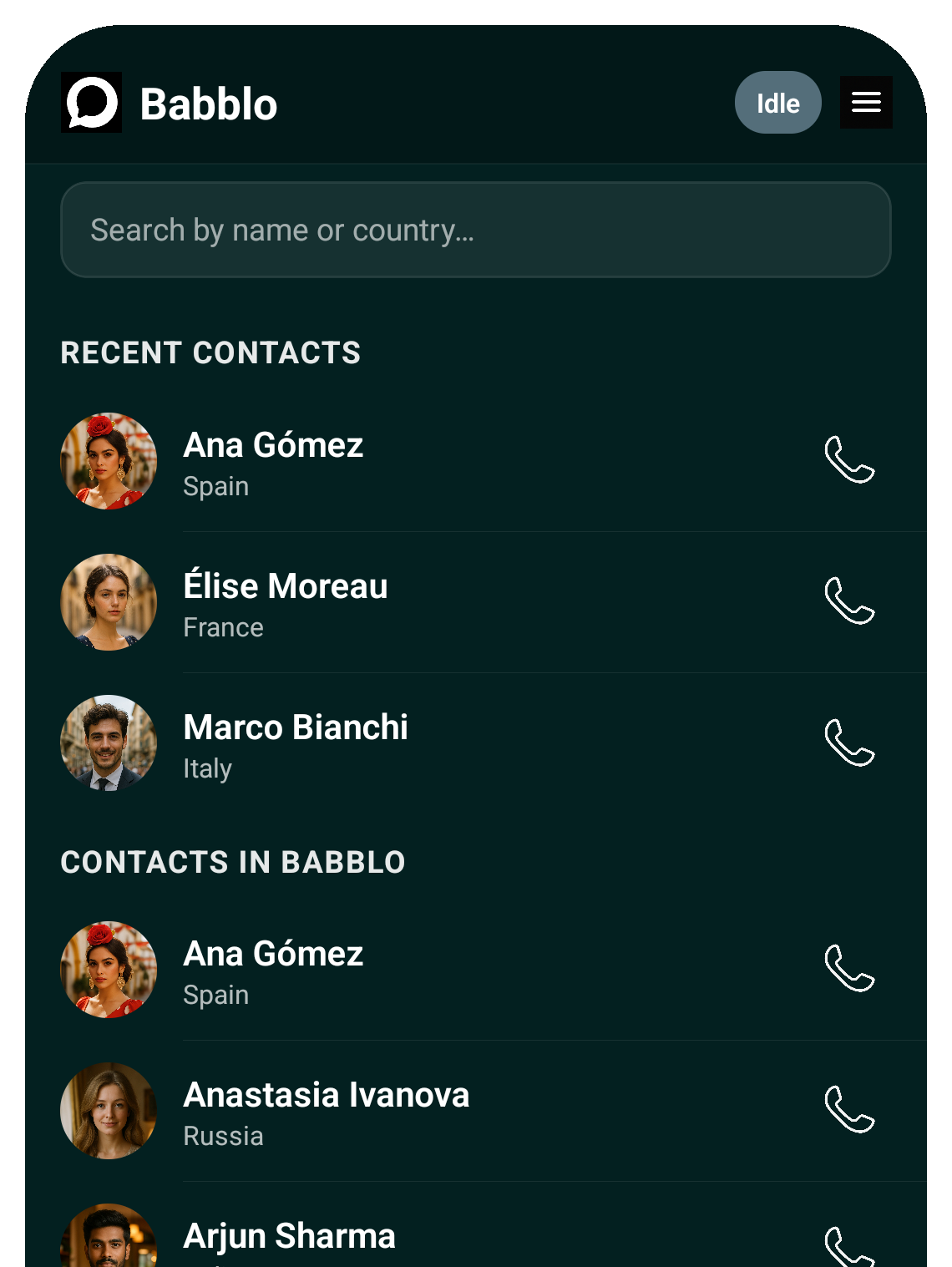 Babblo currently supports Chinese, English, French, German, Greek, Hindi, Italian, Japanese, Portuguese, Russian, and Spanish.